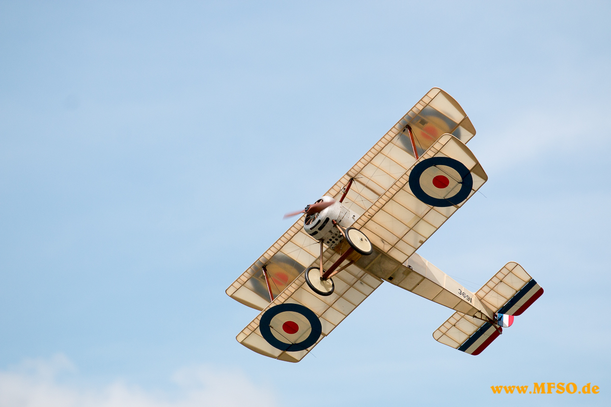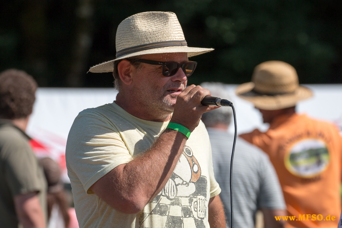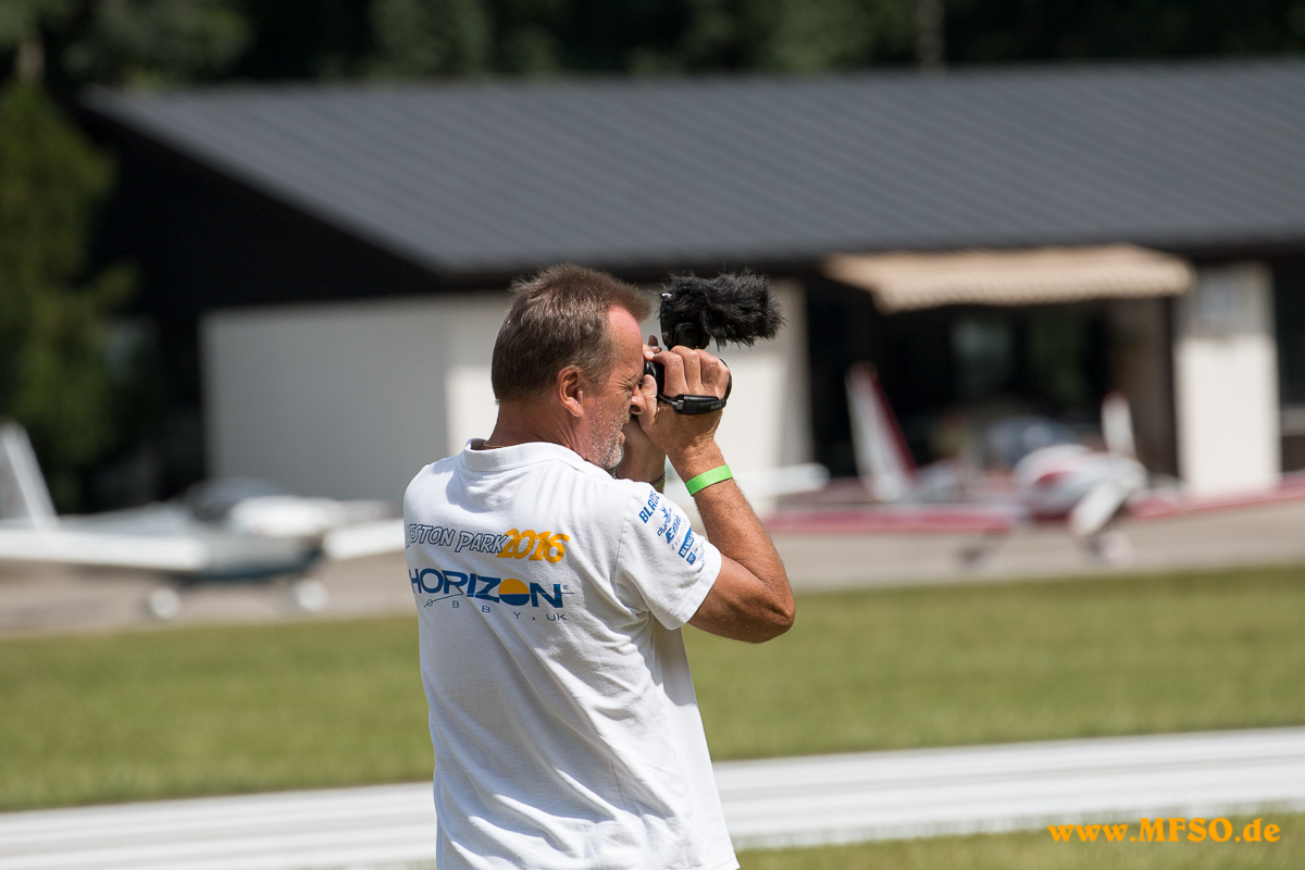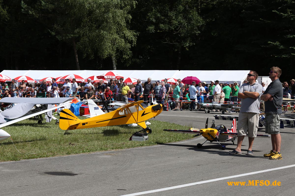 Und die Zuschauer strömten zum Fluggelände, zuerst etliche, nach der Kirche immer mehr und zum Schluss werden es geschätzt rund 3500 (!) gewesen sein. Durch die anwesenden, ca. 60 Piloten, wurde es nötig, den Ablauf straff zu halten, damit jeder die Gelegenheit erhielt, sein Modell vorzuführen. Auch neu in diesem Jahr waren Slots mit zeitlicher Begrenzung, welche schon im Vorfeld vergeben wurden. Dichtgedrängt standen die Gäste an den Absperrungen und staunten über die Vielfalt des Modellfluges. Kunstflugmaschinen mit Elektro- oder Verbrennungsmotor, vorbildgetreue Jets, Warbirds, Segelflieger mit bis zu 8,5m Spannweite, teils mit ausfahrbaren Triebwerken, Hochgeschwindigkeits-Modelle, F-Schlepp in verschiedenen Variationen, kranke 3D-Helivorführungen (um so schmerzfrei fliegen zu können muss man schon sehr wirkungsvolle Pillen zu sich nehmen, möchte wissen, was sich die Jungs einverleiben) aber natürlich auch vorbildgetreue Hubschrauber und einige andere Fluggeräte wie das Heißluft-Luftschiff, welches irgendwie nicht ganz knitterfrei seine Runden drehte.