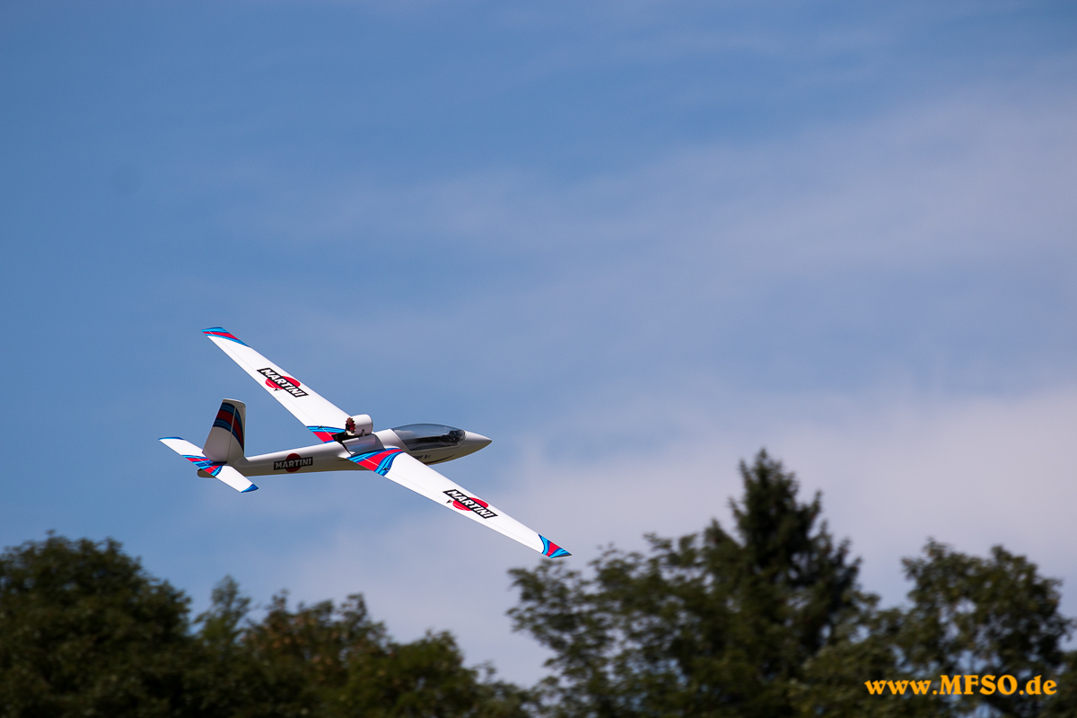 Die Starts und Landungen von Motorseglern und UL-Flugzeugen der Alpen-Segelflugschule lockerten die hochklassigen Modellvorführungen auf. Vom benachbarten Vogtareuth kam mal eben so eine Pitts S2 und ein UL auf einen Sprung vorbei und ließen es sich nicht nehmen ein paar "Turnübungen" zu veranstalten, was mit viel Beifall vom Publikum honoriert wurde. Langsam neigte sich dieser wunderbare Flugtag dem Ende zu, und die Reihen der Besucher und Piloten, teils mit mehreren hundert Kilometern Anreise, lichteten sich zusehends. Um 18.00 Uhr wurde das Ende der regulären Flugvorführungen bekanntgegeben, aber wer wollte konnte noch ein wenig beim freien Fliegen teilnehmen.