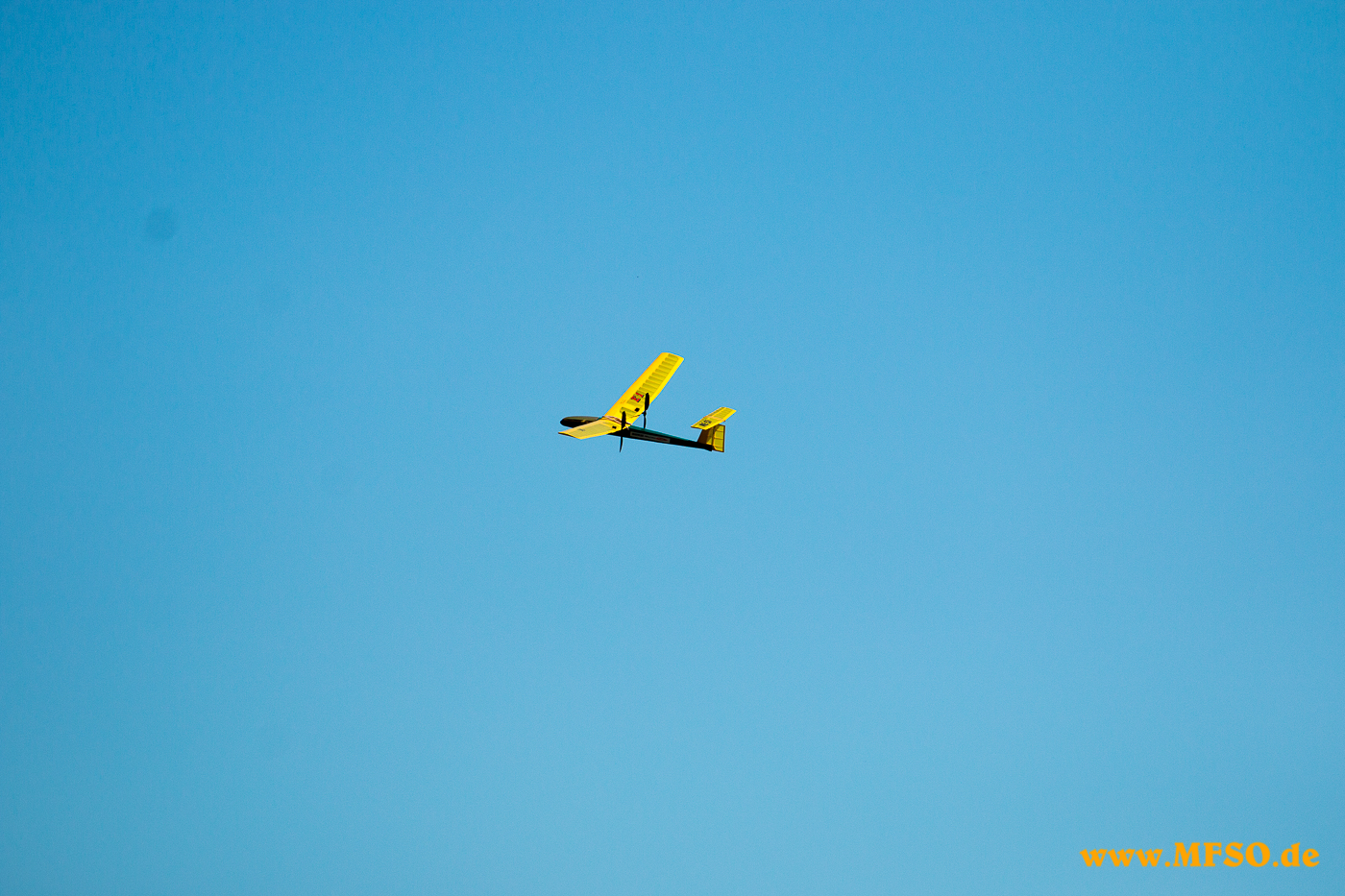 Nach 18.00 Uhr war dann freies Fliegen angesagt, was natürlich auch sehr gut genutzt wurde um die Modelle für Sonntag, dem 2ten Tag der Veranstaltung, zu optimieren oder um sich auf die Nachtflugshow vorzubereiten. Während des freien Fliegens übernahmen jedoch andere Flugobjekte den Luftraum über dem Vereinsgelände. Neben einer grandiosen Flugshow zelebrierten die Hasardeure der Lüfte das Landen auf kleinstem Raum um dort nachzutanken. Allerdings wurden viele denen der „Sprit“ ausgegangen war, durch die Flugabwehr auf Folienstärke geklatscht. Nach vielen, mehr oder weniger erfolgreichen Angriffen bliesen dann die Heerscharen zum Rückzug und gegen 21.00 Uhr herrschten wieder geordnete Verhältnisse über Alzgern/Jaubing.
