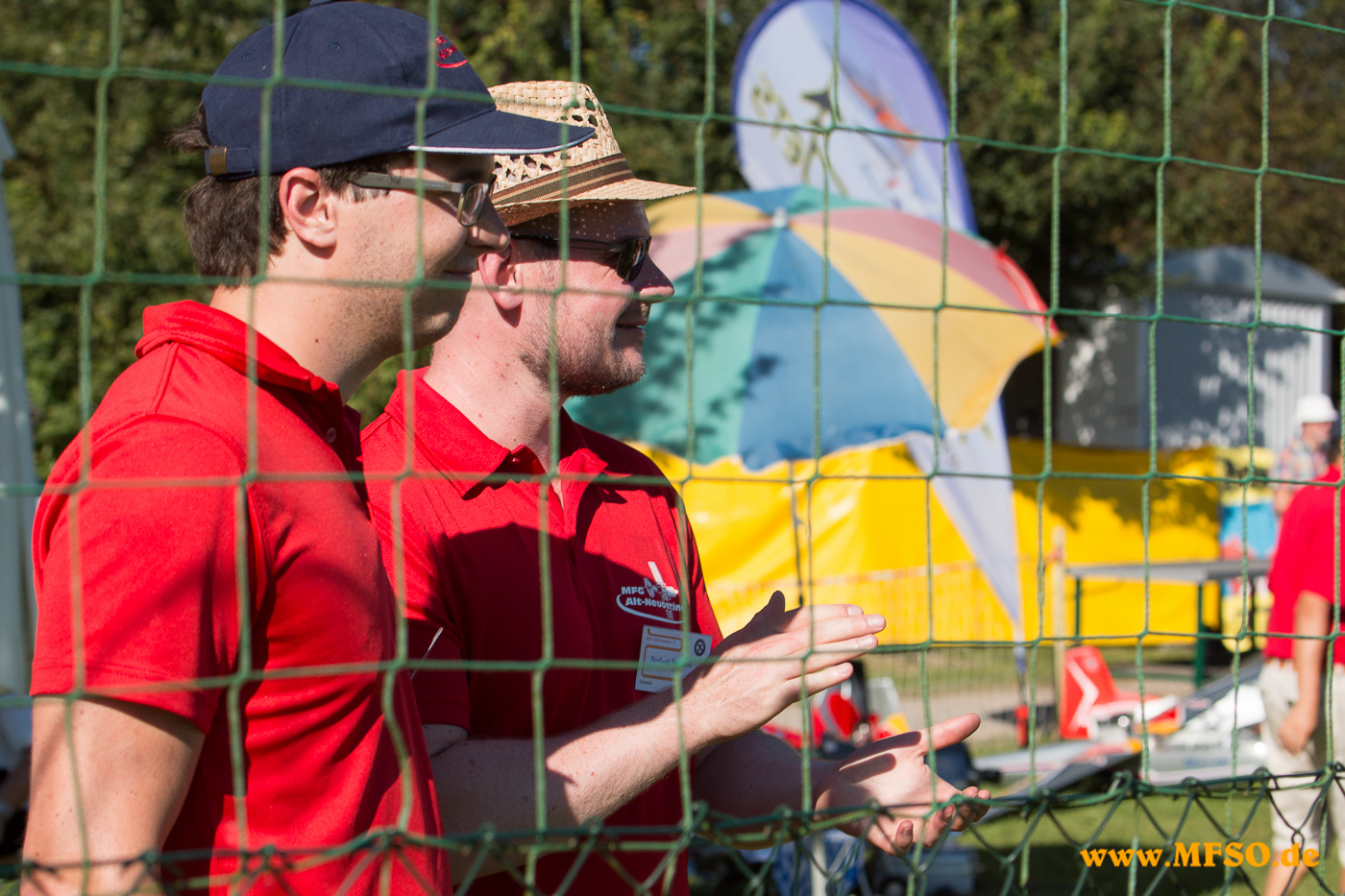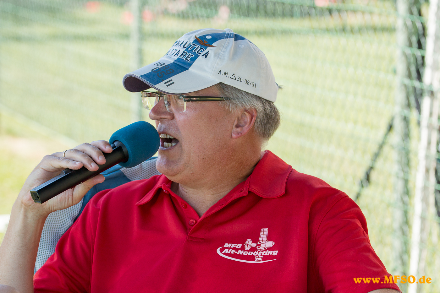 Viele Piloten mit ihrem Modellen trafen bereits am Freitag im laufe des Tages ein, die restlichen kamen dann am Samstag hinzu. Schon sehr früh an diesem, sicherlich sehr heißen Samstag waren bereits die ersten Modelle in der Luft um sich „warm“ zu fliegen. In lockerer Reihenfolge waren dann die unterschiedlichsten Modelle in der Luft, aber auch im Vorbereitungsraum, zu sehen. Die stets mehr werdenden Gäste kamen aus dem staunen nicht mehr heraus und stellten den Piloten, nach den Flugslots, sehr interessiert ihre Fragen, welche auch umgehend beantwortet wurden. In dieser sehr lockeren Atmosphäre ging es weiter, bis ca. 13.00 Uhr als zum offiziellen Briefing gebeten wurde. Vereinsvorstand Peter Edhofer, die Flugleiter und natürlich der Sprecher, Jürgen Gollnow, wie immer charmant, humorvoll und fachlich sehr kompetent, richteten das Wort zum Sonntag an alle teilnehmenden Piloten. Erwähnenswert und sicherlich auch nachahmenswert hierbei ist, dass neben der akustischen Erklärung des Luftraumes während der Pilotenbesprechung, auch eine Tafel ausgehängt war, auf welcher schwarz auf weiß zu lesen war welcher Luftraum während der Flugtage freigegeben war.