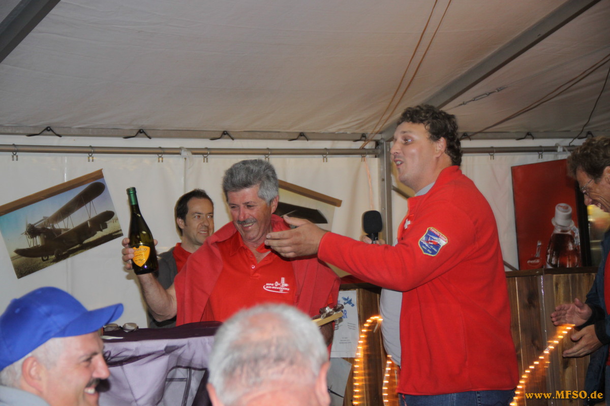 Nach Ende der Flugvorführungen, am frühen Abend, wurde von der MFG-Alt/Neuötting zum gemeinsamen Pilotenabendessen geladen und das bereitgestellte Zelt, welches die MFG-ler mit ca. 400 Photos aus der Geschichte des Vereins ausgeschmückt hatten, war bald darauf gut besetzt. Nach der Stärkung von Leib und Seele hielt der Vereinsvorsitzende Helmut Höller eine kleine Ansprache zum 40jährigen Jubiläum des Vereins, in der auch insbesondere auf die Nachbarvereine eingegangen wurde. Und eben diese erwähnten Nachbaren sorgten im weiteren Verlaufe des Abends für die eine oder andere Überraschung in Form von einem süffisanten Verslein und einigen, "kleinen" Präsenten, darunter eine zentnerschwere "Jubiläumsbank". Nach lange anhaltenden Ovationen ging man dann zum Nachtfliegen über.