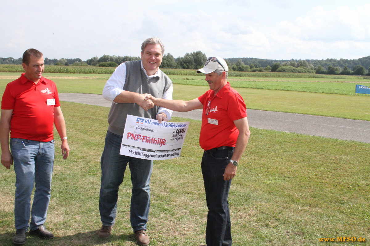 Am zweiten Tag der Jubiläumsveranstaltung gab es neben etlichen neuen Piloten, welche am Samstag verhindert waren und ihren Modellen eine Ehrung durch den Dachverband DMFV, vertreten durch den Gebietsvertreter Markus Eiglsperger, in Form einer Urkunde für die gesamte Vorstandschaft der MFG-Alt/Neuötting. Nach eingehenden Beratungen hatte die MFG beschlossen auf Präsente für die teilnehmenden Piloten zu verzichten und stattdessen die Flutopferhilfe finanziell zu unterstützen. Ein Vertreter der "Neuen Passauer Presse" nahm den Scheck in Höhe von 1000.-- Euro, unter dem Applaus aller Anwesenden, dankend entgegen.