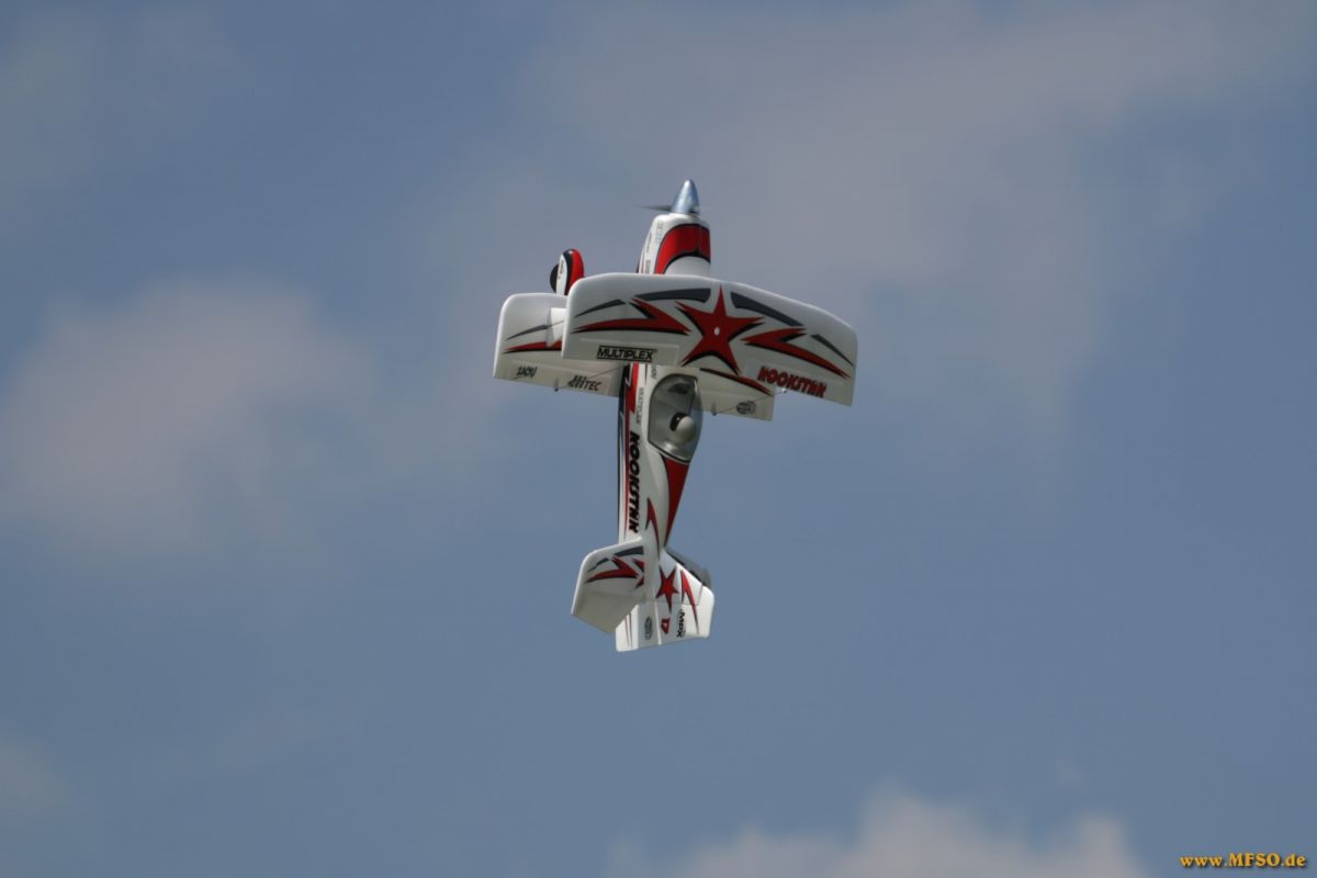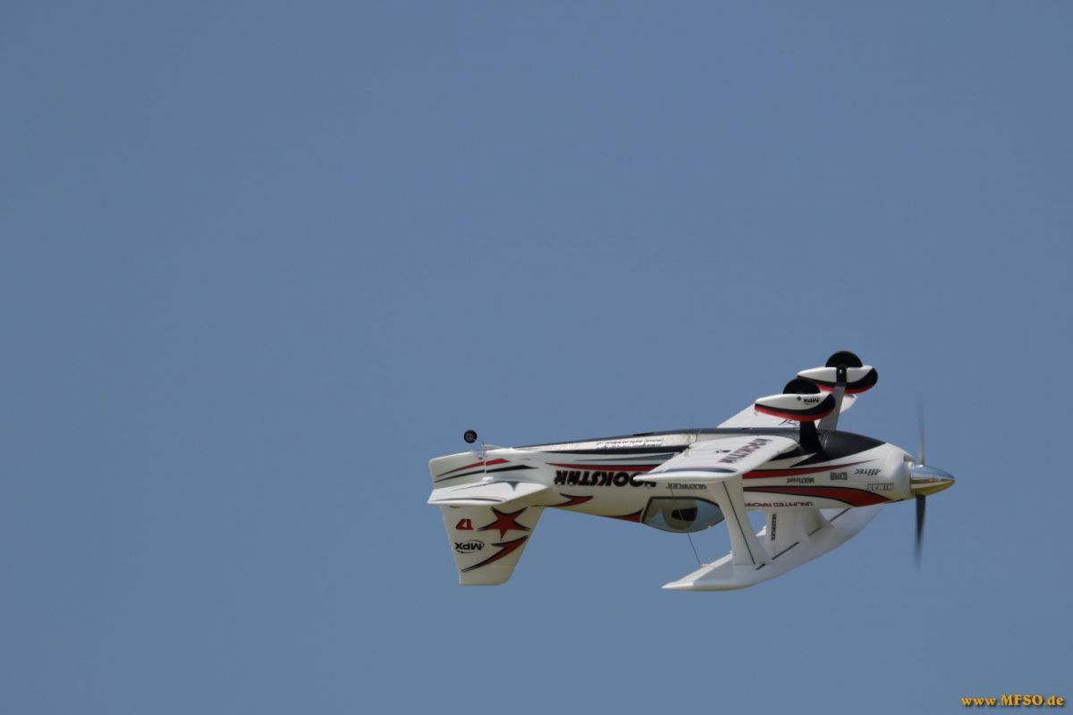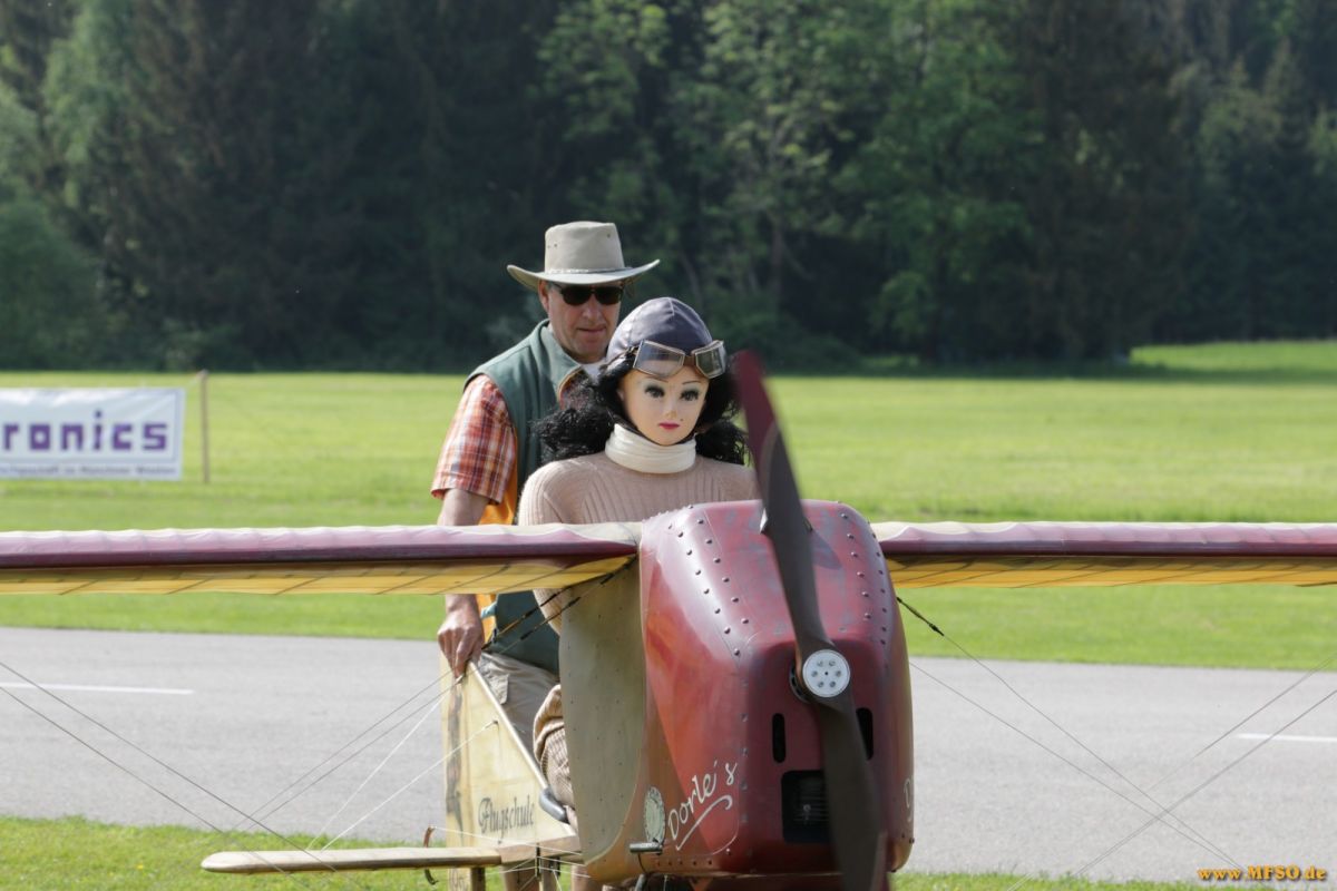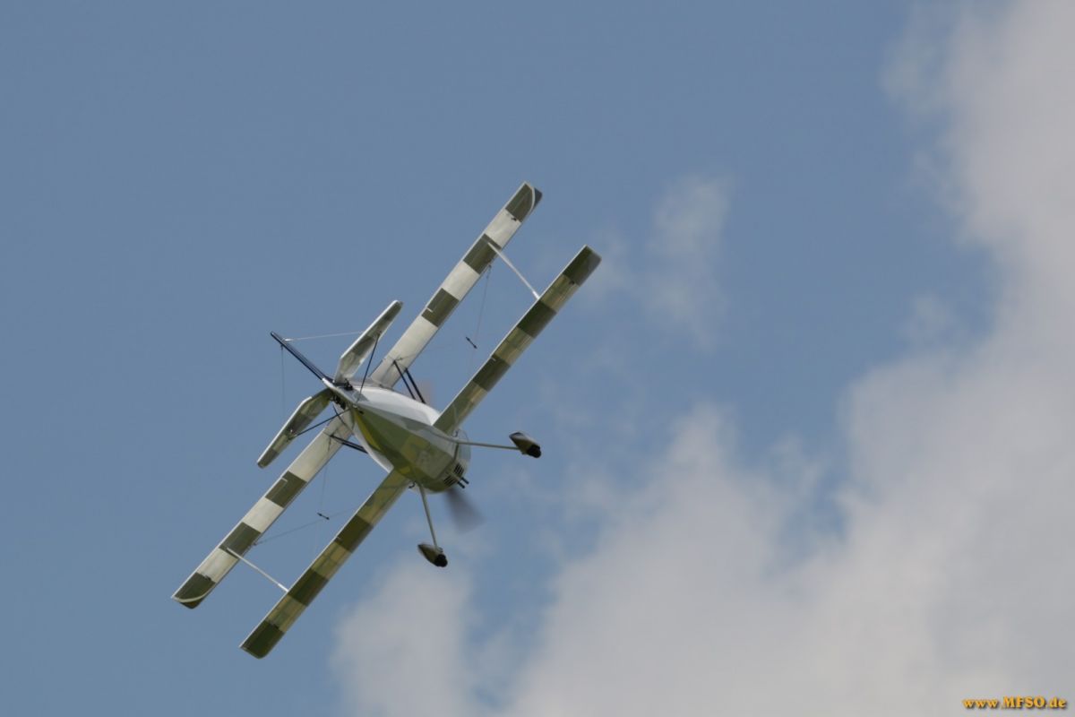 Nach der ersten, offiziellen Flugvorführung, Eurofighter mit Schubvektorsteuerung in gefälligem Rot lackiert, jagte ein Highlight das nächste. Und so konnte das , bereits zahlreich erschienene, Publikum von historischen Doppeldeckern, hochmodernen Jets, superschnellen Flächenmodellen und Helis, eine fliegende Hexe und absolut vorbildgetreue Hubschrauber auch eine bayrische Schleppsau und ein Himmelsmoped (das Original stammt aus dem Jahre 1921) am, mittlerweile strahlend blauen, Himmel bewundern. Alle Modelle hier zu erwähnen würde den Bericht bei weitem sprengen. Zusätzlich präsentierten die anwesenden Firmen mit ihren Werkspiloten, mit viel Spass, den vielen Besuchern verschiedene Modelle aus ihrem Sortiment.