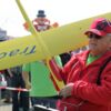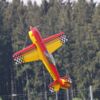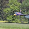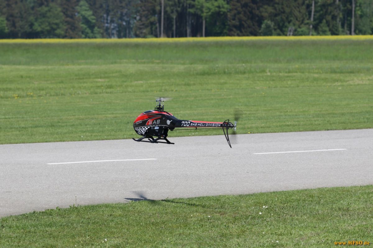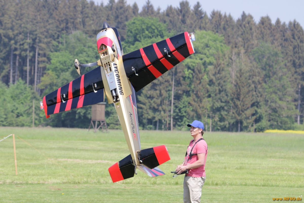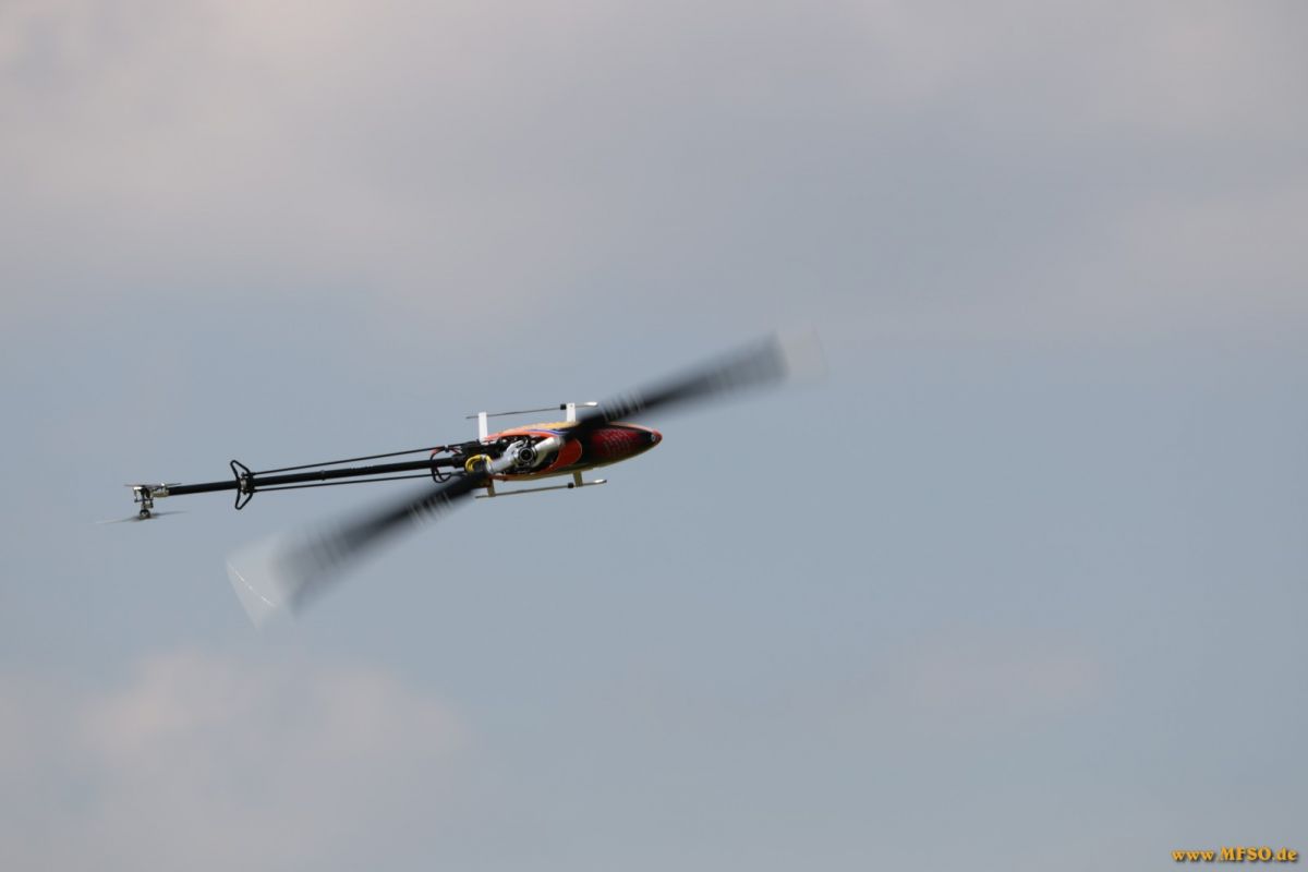 Nach der ersten, offiziellen Flugvorführung, Eurofighter mit Schubvektorsteuerung in gefälligem Rot lackiert, jagte ein Highlight das nächste. Und so konnte das , bereits zahlreich erschienene, Publikum von historischen Doppeldeckern, hochmodernen Jets, superschnellen Flächenmodellen und Helis, eine fliegende Hexe und absolut vorbildgetreue Hubschrauber auch eine bayrische Schleppsau und ein Himmelsmoped (das Original stammt aus dem Jahre 1921) am, mittlerweile strahlend blauen, Himmel bewundern. Alle Modelle hier zu erwähnen würde den Bericht bei weitem sprengen. Zusätzlich präsentierten die anwesenden Firmen mit ihren Werkspiloten, mit viel Spass, den vielen Besuchern verschiedene Modelle aus ihrem Sortiment.