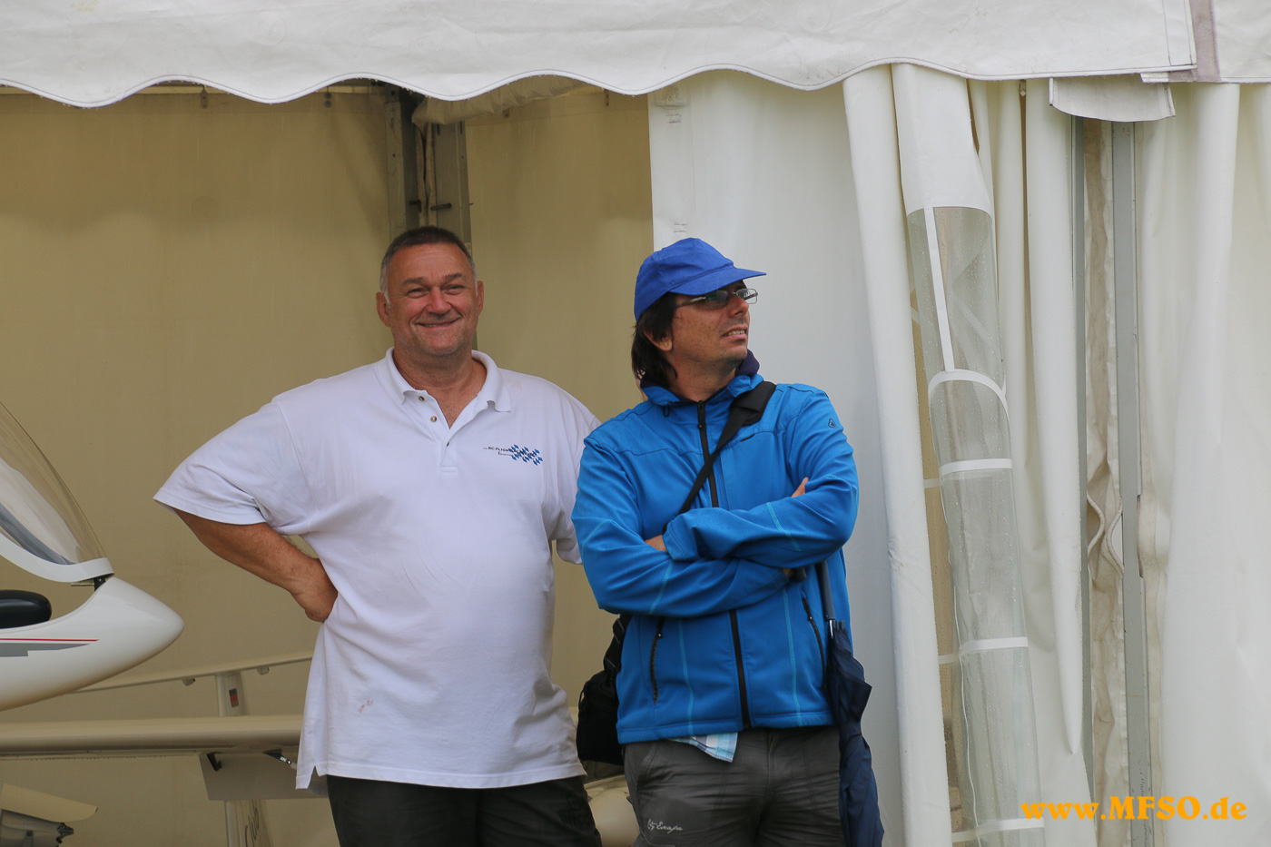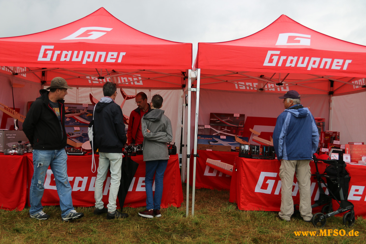 Am Morgen hatte das Messegelände durchaus noch etwas von einer notdürftigen Zeltstadt, da alle versucht haben die Ausstellungstücke mittels Plastikplanen vor dem fiesen Regen zu schützen. In der rund dreistündigen Regenpause lüfteten sich aber die Abdeckungen und alle Aussteller konnten ihre Waren präsentieren. Natürlich war, wie schon in den Jahren zuvor, eindeutig der Trend zu absoluten Superorchideen zu beobachten. Spannweiten mit weit über 6Metern , Voll-GFK und Voll-CFK, Schalenbauweise, perfekte Aerodynamik, bis ins kleinste Detail ausgefeilt usw. usw. Daneben waren natürlich die verschiedensten Arten von Antrieben für die Segelflugmodelle zu sehen, egal ob Klapptriebwerk, Ausfahrimpeller, Nasenantrieb oder gar Turbine in den unterschiedlichsten Bauweisen.
